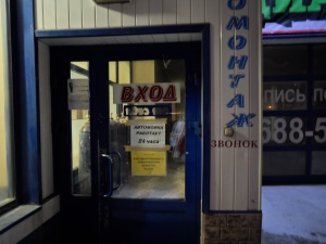 Дверь закрыта; какой-нибудь кнопки для вызова или надписей "звоните по телефону 24 часа, мы откроем" не обнаружилось. На сайте большими буквами написано "КРУГЛОСУТОЧНОЕ СТО".